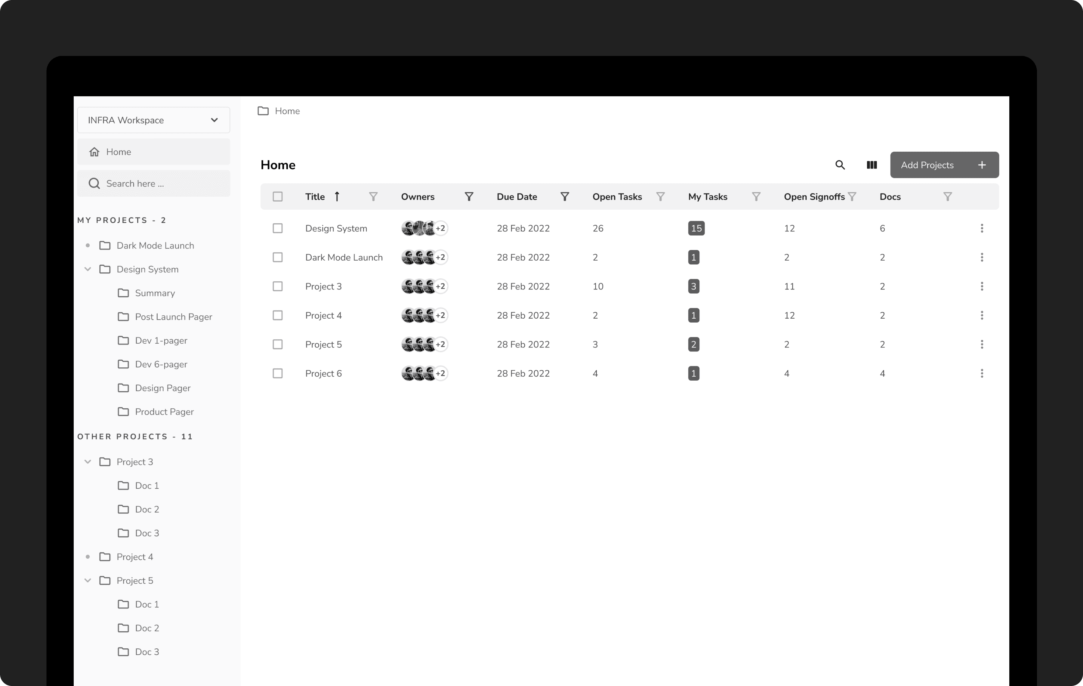 I built a complete end-end task manager from scratch. Tasks are associated to Projects and Documents and can be assigned to anyone.