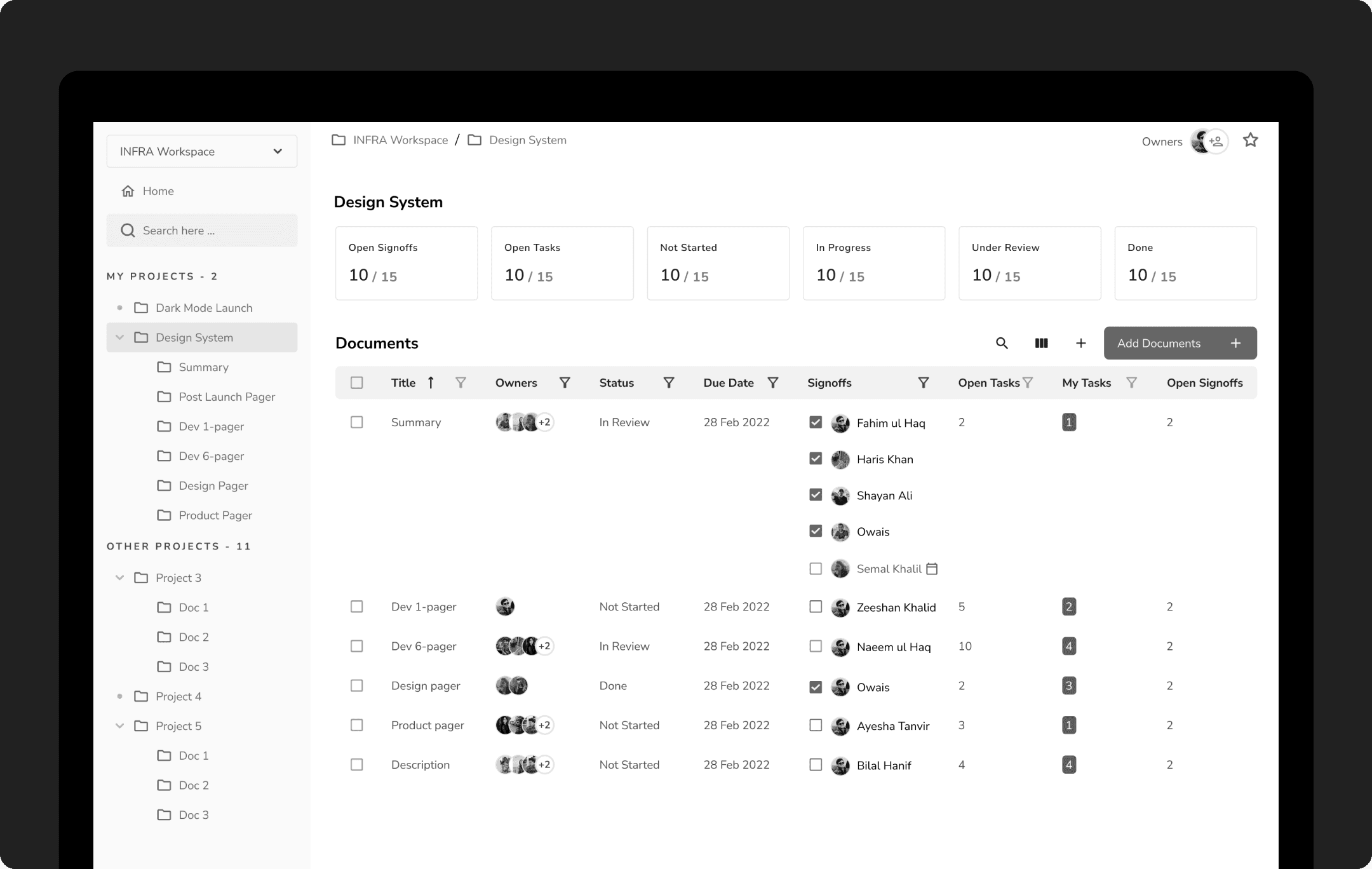 This is the page where users spend most of their time. It went through several iterations since so many features are dependent on it. Tasks and reviews are part of the document. It can have multiple states ranging from Not Started to Done.